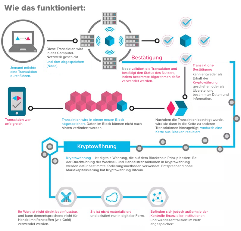 Die Blockchain-Technologie ist ein dezentralisiertes Datenbanksystem, das dazu dient, z. B. digitale Finanztransaktionen zwischen zwei Parteien extrem sicher zu machen, ohne dass dafür eine Bank als Vermittler auftreten muss. Dies erleichtert und beschleunigt Bezahl- oder Vertragsvorgänge und macht sie sehr zuverlässig. So verwenden Banken für ihre Transaktionen diese Technologie selbst, ebenso wie Regierungsorganisationen und zunehmend mehr auch Unternehmen und Privatpersonen. Das Funktionsprinzip der Blockchain ist in der unten stehenden Infografik dargestellt: